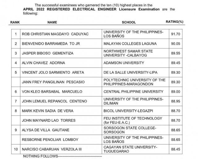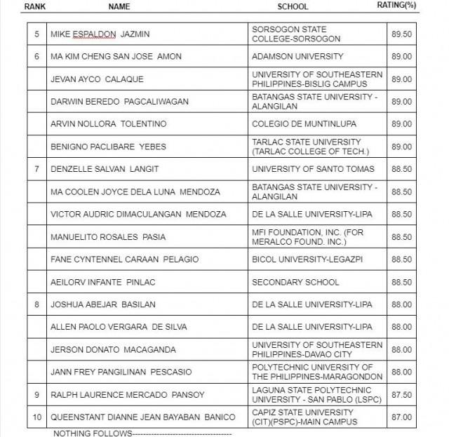 Rob Christian Magdayo Caduyac gained a 91.70 percent rating to gain the first place slot in the list of Top 10 examinees. The other successful examinees in the Top 10 are: