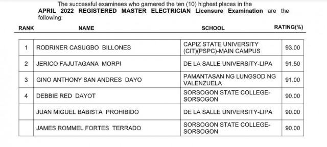 Meanwhile, Capiz State University - Main Campus graduate - Rodner Casugbo Billones - was the first placer for the April 2022 Master Electrician Licensure Examinations. He was among the 1,717 who successfully hurdled the exams. The others who made it to the Top 10 list are:
