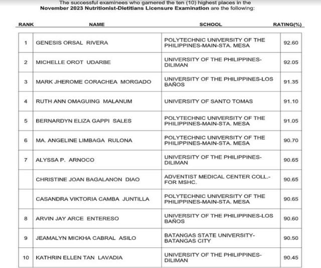 Genesis Orsal Rivera garnered the highest percentage rating of 92.60 among 895 who successfully hurdled the exam that was administered the Board of Nutrition and Dietetics in NCR, Baguio, Cebu, Davao, Legazpi, Lucena, Rosales and Zamboanga earlier this month.