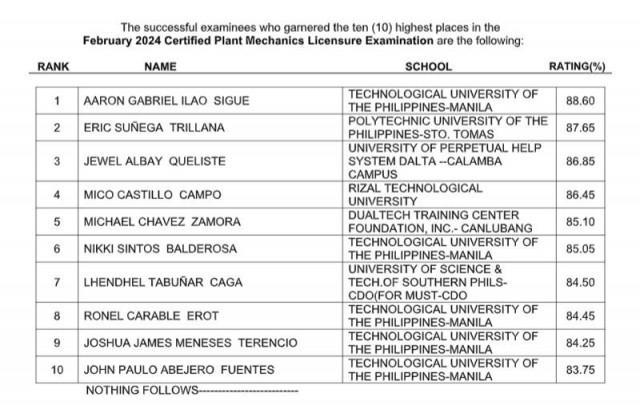 Meanwhile, the topnotcher for the February 2024 Certified Plant Mechanics Licensure Examination is Aaron Gabriel Ilao Sigue from the Technological University of the Philippines - Manila with a percentage rating of 88.60%.