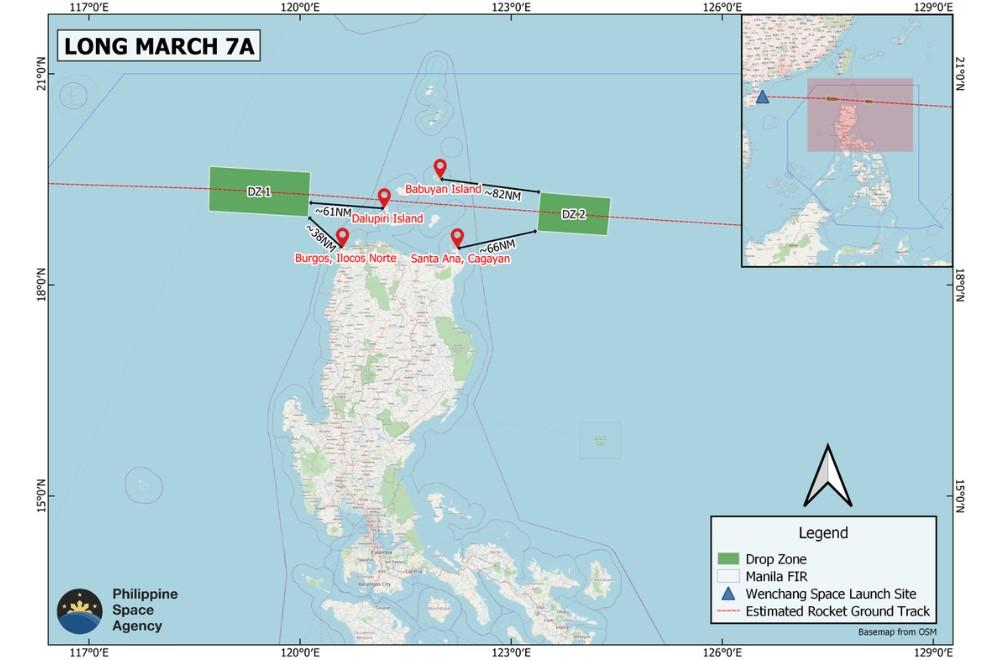 The launch of the Long March 7A rocket from the Wenchang Spacecraft Launch Site in Hainan, China, could result in debris landing in Philippine waters.