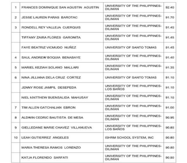 Frances Dominique San Agustin Agustin topped the list with a percentage rating of 92.40, the highest score among 843 who successfully hurdled the examination.