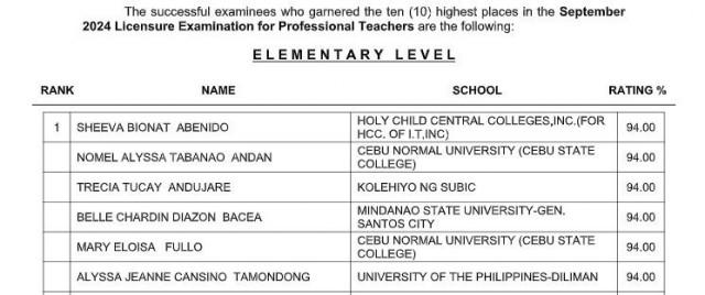 Mary Eloisa Fullo is listed among six graduates who are the first placers for the Elementary level with all of them having a percentage rating of 94.00%. There were 20,025 elementary teachers who passed the exams out a total of 44,002 examinees.