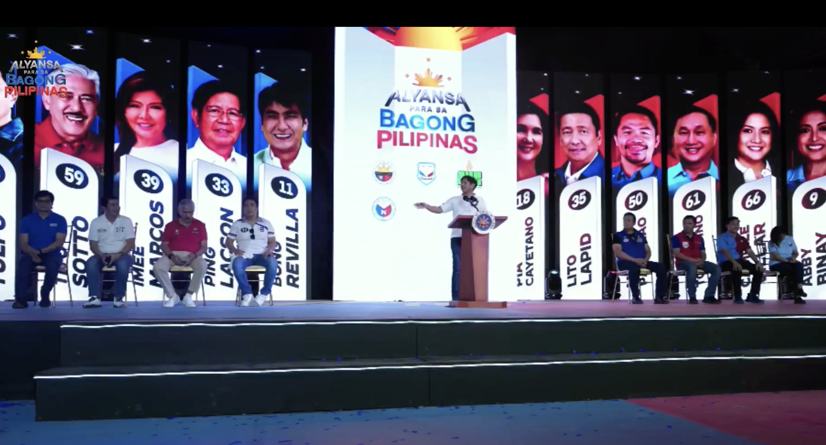 Present at the administration ticket's campaign rally in Pasay City on Tuesday were former Interior Secretary Benhur Abalos, Makati City Mayor Abby Binay, Senator Pia Cayetano, Senator Lito Lapid, Senator Imee Marcos, Senator Ramon “Bong” Revilla Jr., former Senate President Vicente “Tito” Sotto III, Senator Francis Tolentino, former Senators Panfilo “Ping” Lacson and Manny Pacquiao, ACT-CIS party-list Rep. Erwin Tulfo, and House Deputy Speaker Camille Villar.