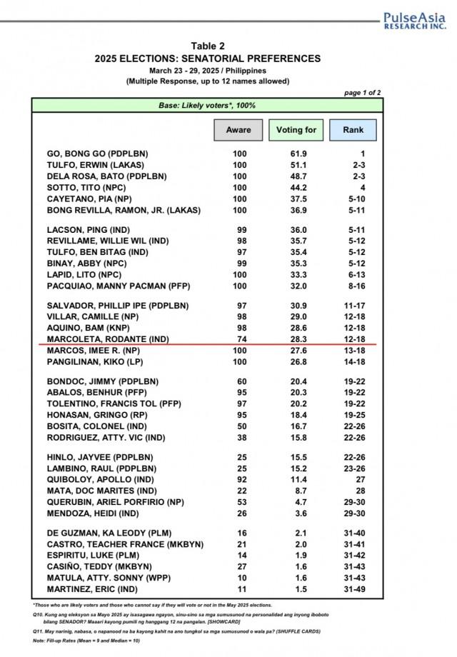 - SAGIP Party-list Representative Rodante Marcoleta (28.3%, 12th to 18th places).