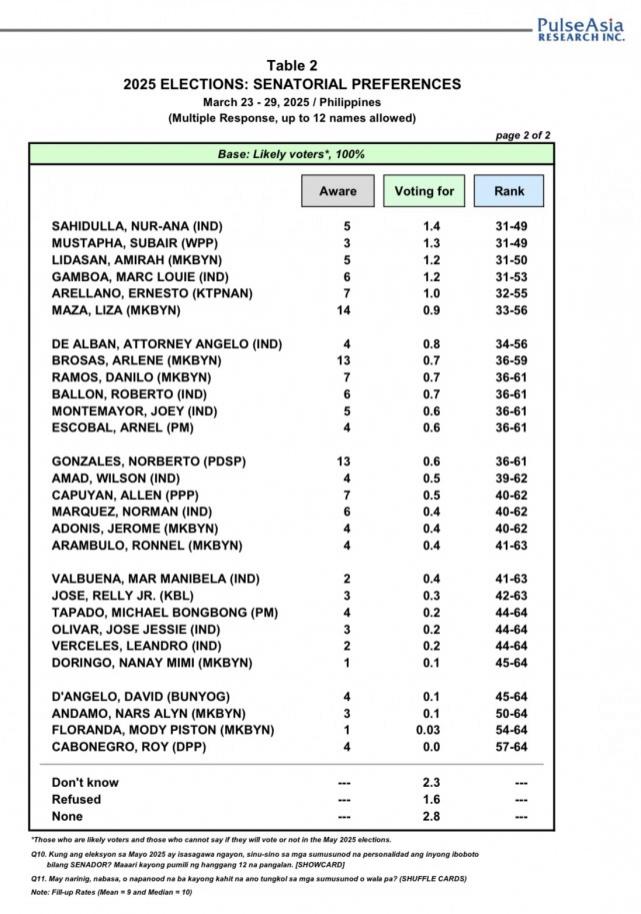 - former senator Emmanuel Pacquiao (32.0%, 8th to 16th places);