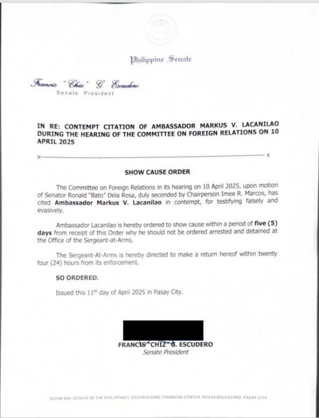 “Ambassador Lacanilao is hereby ordered to show cause within a period of five days from receipt of this order why he should not be ordered arrested and detained at the Office of the Sergeant-at-Arms,” the Senate chief said.