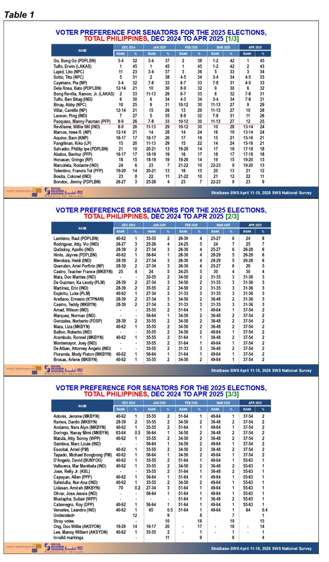 Reelectionist Senator Bong Go remained as the top senatorial bet for the 2025 midterm elections, based on a commissioned survey conducted by the Social Weather Stations (SWS) in April.