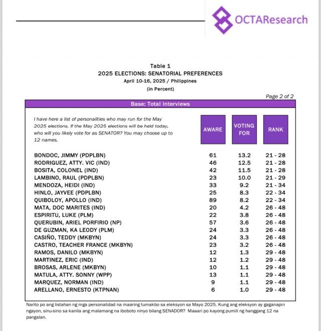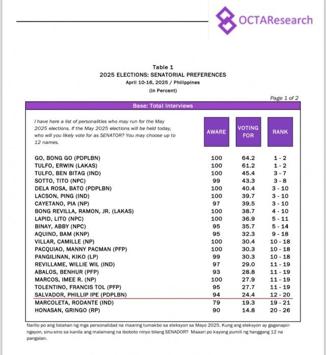 Bong Go, Erwin Tulfo maintain lead in OCTA’s April 2025 Senate survey