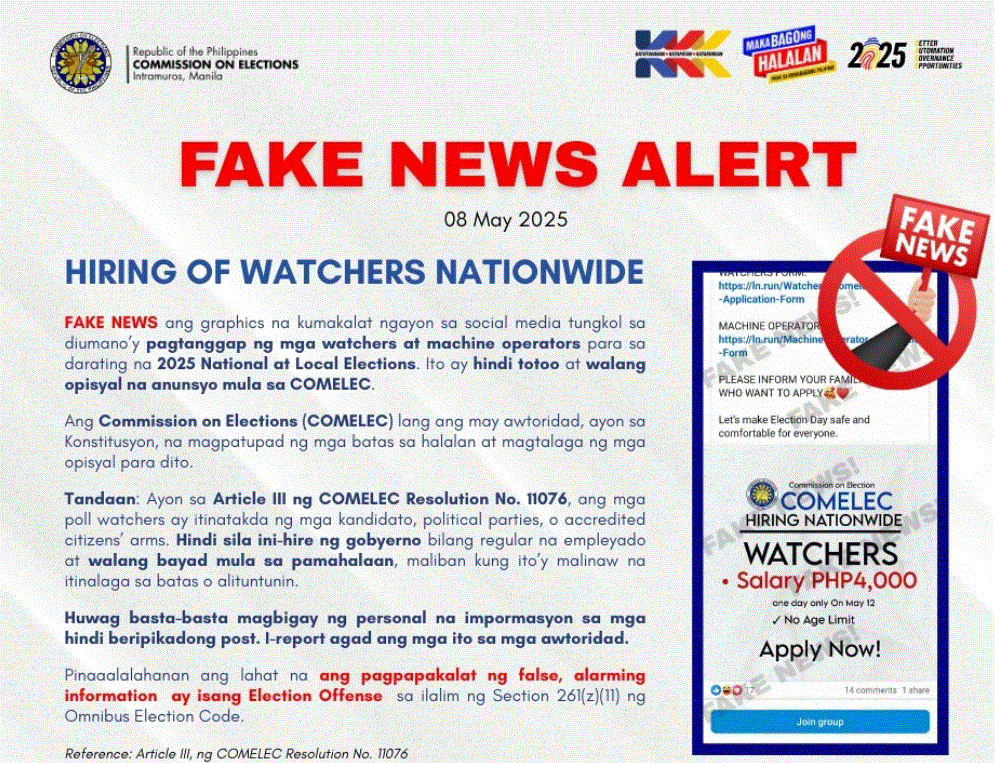 “Fake news ang graphics na kumakalat ngayon sa social media tungkol sa diumano’y pagtanggap ng mga watchers at machine operators para sa darating na 2025 National at Local Elections. Ito ay hindi totoo at walang opisyal na anunsyo mula sa Comelec,” said the Comelec in a statement on Thursday.
