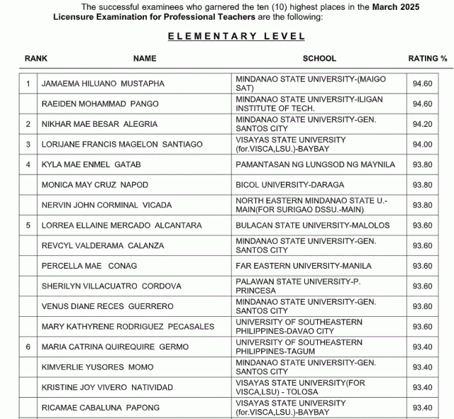 According to the PRC, 16,282 elementary teachers out of 34,810 examinees (46.77%) and 38,747 secondary teachers out of 62,225 examinees (62.27%) successfully hurdled the examinations given last March 23, 2025 in 38 testing centers all over the country.