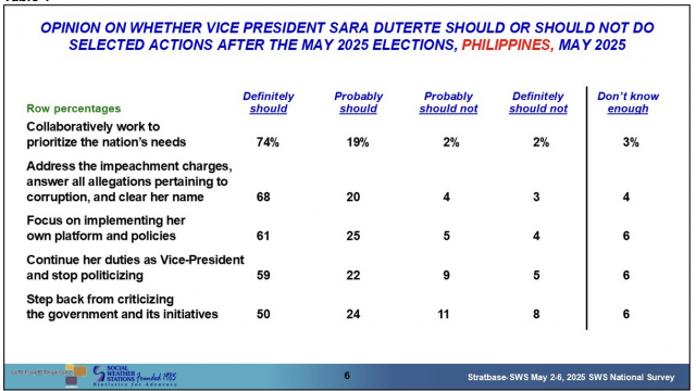 Ninety-three percent of registered Filipino voters are of the opinion that Vice President Sara Duterte should “collaboratively work to prioritize the nation’s needs,” the results of the Stratbase-SWS survey conducted from May 2 to 6 showed.