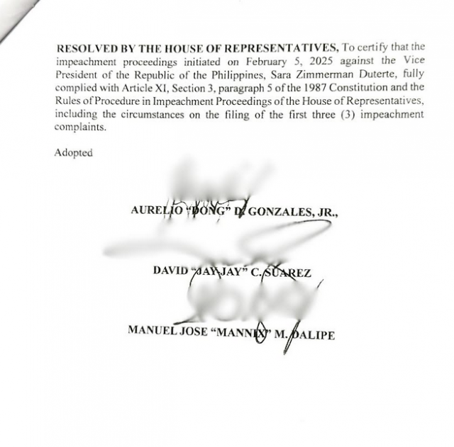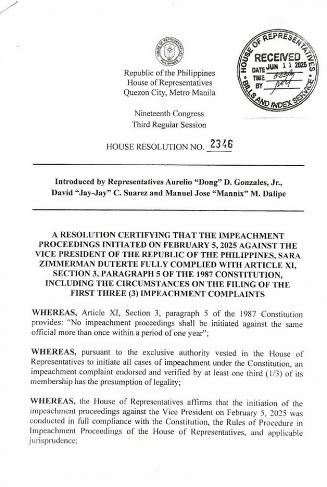 In a voice vote, the House plenary adopted House Resolution No. 2346, which certified that the impeachment initiated on February 5, 2025, against Sara Duterte fully complied with the constitution, including the circumstances on the filing of the first three impeachment complaints.