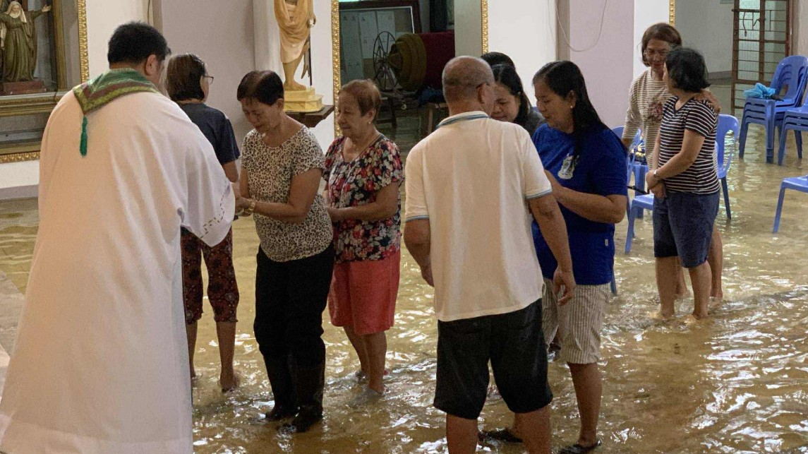 In Hagonoy, Bulacan, ankle-deep water inside the St. John the Baptist Parish church did not prevent the Eucharistic celebration from pushing through.