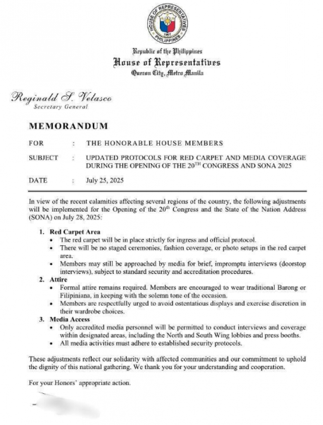 House Secretary General Reginald Velasco on Friday issued a memo for the austere holding of the State of the Nation Address (SONA) on Monday.