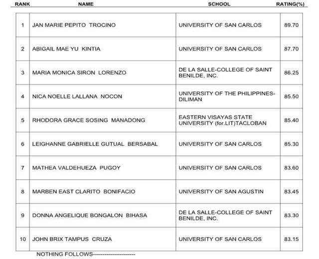 Jan Marie Pepito Trocino gained a percentage rating of 89.70, the highest among 226 who passed the examination.