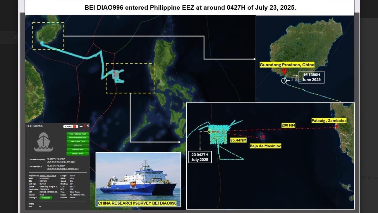 Bei Diao 996, which Tarriela said as involved in MSR activities about 40 nautical miles west of Bajo de Masinloc, was last spotted 185 nautical miles off the coast of Zambales.