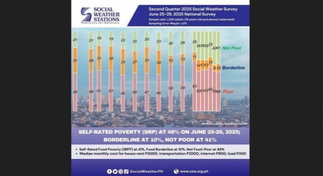 ''The one-point decline in the nationwide Self-Rated Poverty between April 23-28, 2025 and June 25-29, 2025 was due to declines in the Visayas and Balance Luzon (or Luzon outside Metro Manila), combined with increases in Mindanao and Metro Manila,'' SWS said.