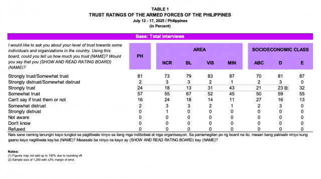 The survey showed 81% trust ratings and an 82% performance rating for the AFP. The numbers were a major boost from April 2025’s 65% for both trust and performance ratings.
