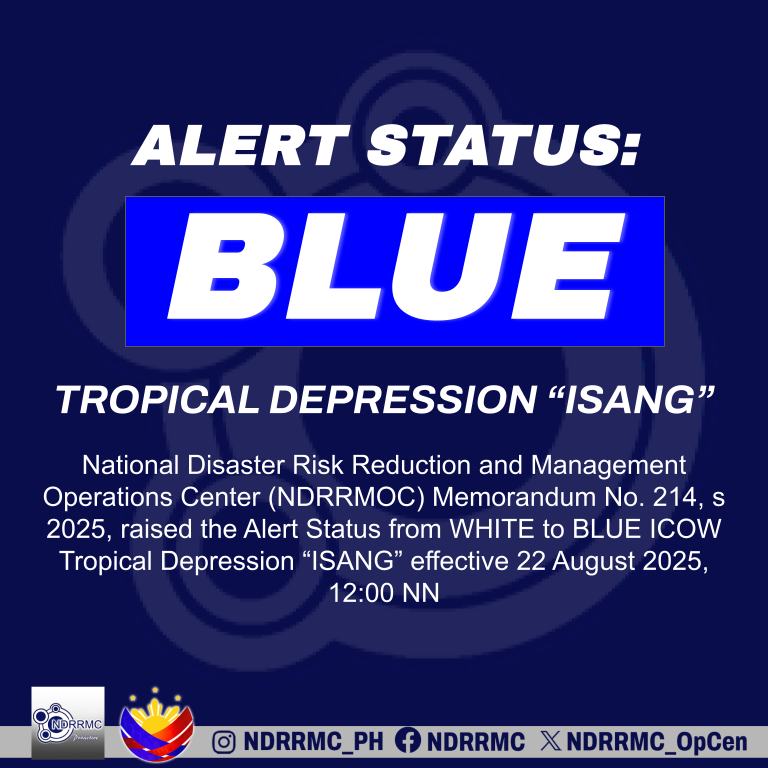 The operations center of the National Disaster Risk Reduction and Management Council (NDRRMC) on Friday upgraded its alert status from white to blue as it stepped up preparations for the potential effects of Tropical Depression Isang.