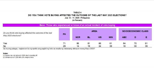 Of the respondents who are aware, most of the respondents who believed vote buying affected the election results were in the National Capital Region with 86% and socio-economic class A, B, and C with 84%.