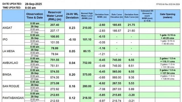 San Roque’s release of 508.31 cms. A secondary gate configuration was also observed at Binga, with two gates at 1.0 meter releasing 161.57 cms. —RF, GMA Integrated News