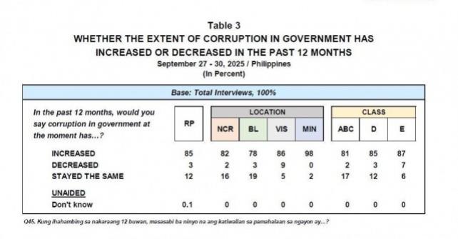 The same Pulse Asia survey showed that 85% of Filipinos believe government corruption increased in the last 12 months, while 12% said government corruption stayed the same.