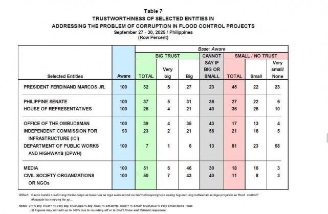 Only 7% of those surveyed believed that the Department of Public Works and Highways (DPWH) can be trusted to address government corruption in flood control projects.