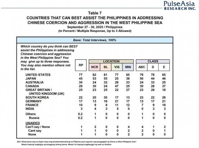 Around 77% of Filipinos believe that the United States is the best country to help the Philippines in addressing Chinese coercion in the West Philippine Sea (WPS), according to survey results from Pulse Asia released Wednesday.