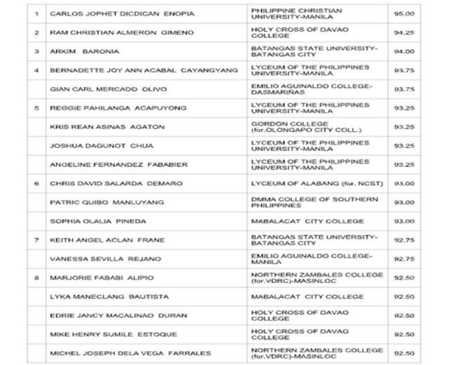 Carlos Jophet Dicdican finished with a rating of 95%, the highest among 2,238 passers.
