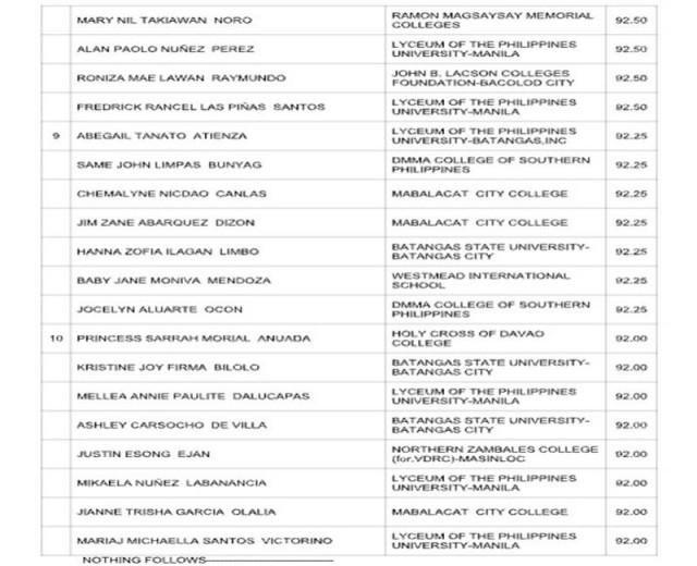 The rest of the passers who made it to the Top 10 list area as follows: