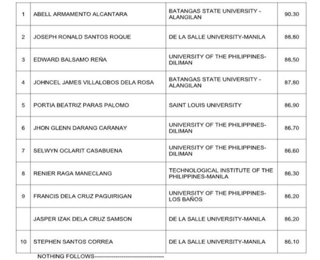 Abell Armamento Alcantara garnered 90.30 percentage rating, the highest among 719 exam passers.