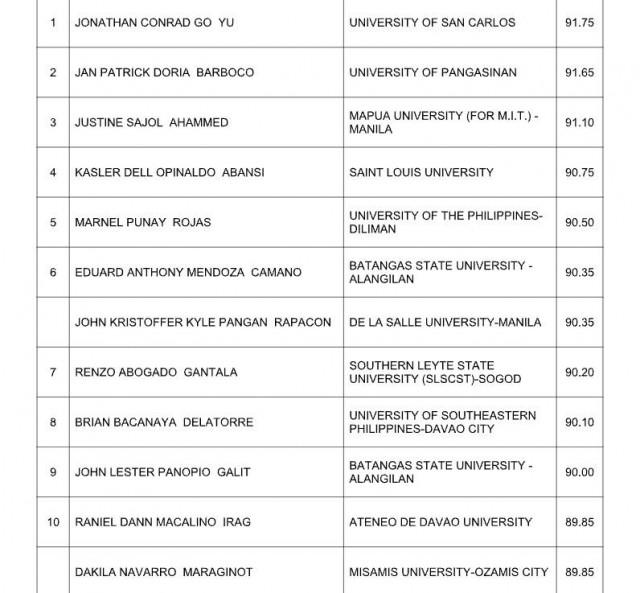 The rest of the examinees who made it to the Top 10 list are as follows: