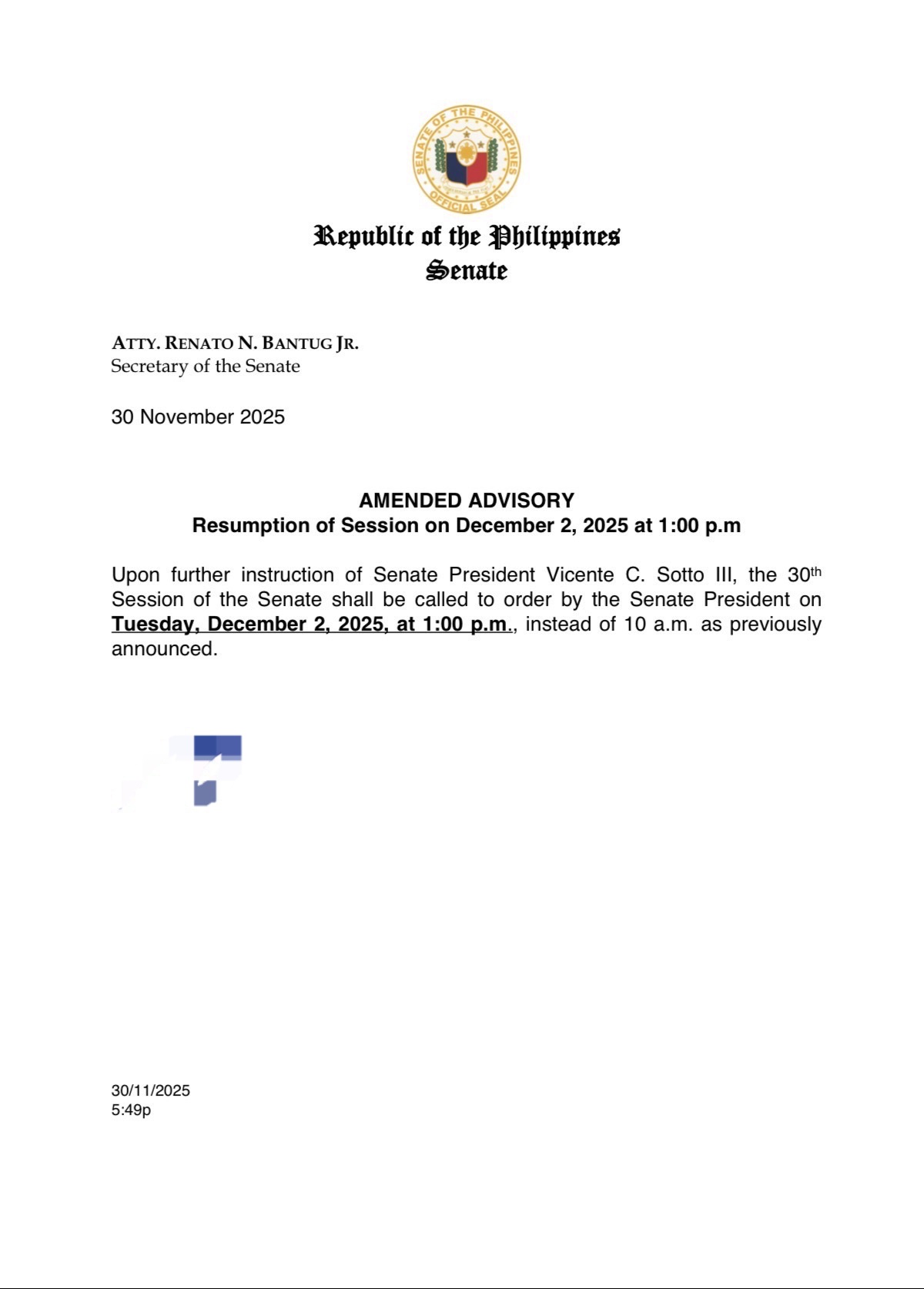 According to an advisory issued by Senate secretary Renato Bantug Jr., the Senate’s plenary session shall be called to order at Tuesday, 1 p.m. as instructed by Senate President Vicente “Tito” Sotto III.