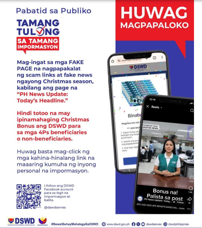 “Ang DSWD po ay may nakuhang mga reports tungkol sa mga naglalabasan na social media posts na may ipapamahagi raw na Christmas bonus sa mga benepisyaryo ng 4Ps. Ito po ay hindi totoo at maaaring isang mekanismo ng mga online scammers para makuha ang mga pribadong impormasyon ng ating mga beneficiaries,” said Social Welfare Assistant Secretary Irene Dumlao in a statement.