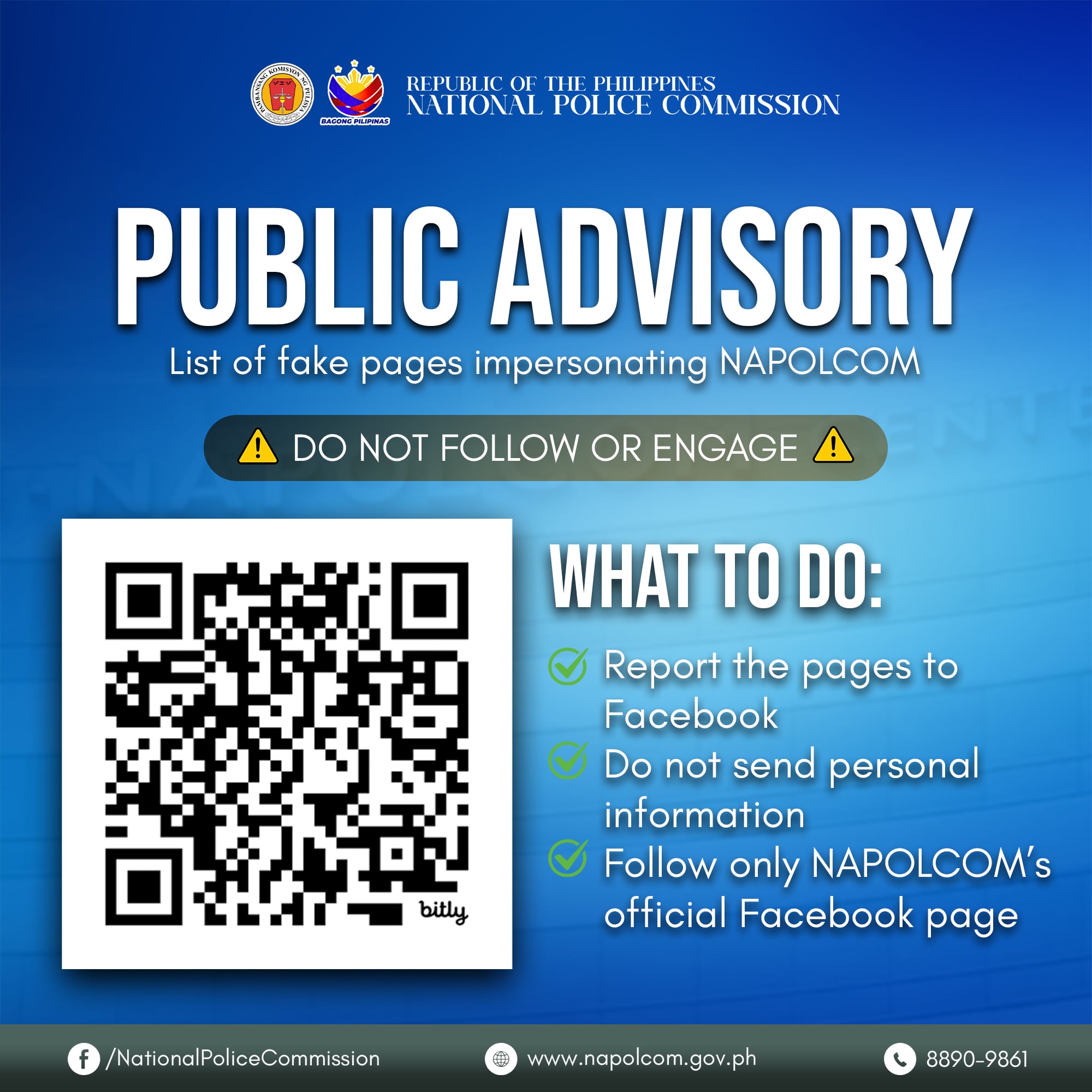 It also urged the public to report suspicious Facebook pages through official NAPOLCOM channels such as its official Facebook page, @NationalPoliceCommission.