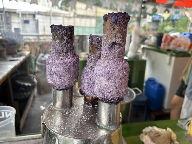 On the other hand, the puto bumbong’s vibrant purple nicely contrasts with the yellow shredded cheese and butter, with brown muscovado sugar on top.