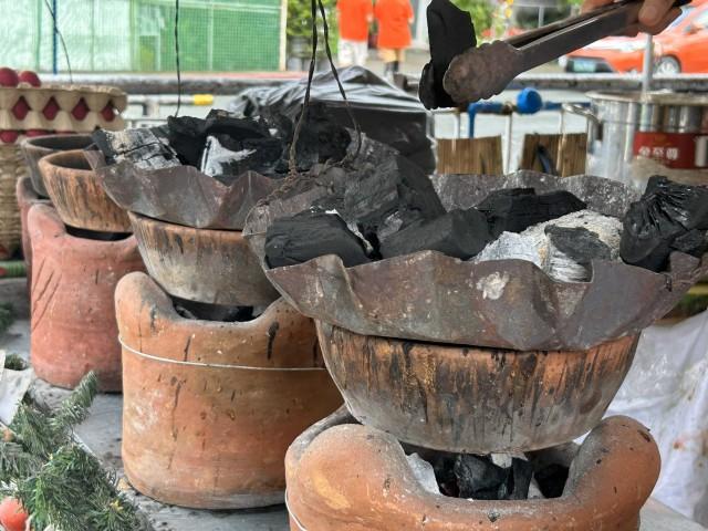 The preparation of the two Filipino Christmas specialties is a sensory experience – the smell of the burning charcoal combining with the aroma from the banana leaf and the cooking bibingka, and the sight of the steam coming from the bamboo tubes, where the purple puto bumbong is being steamed to perfection.