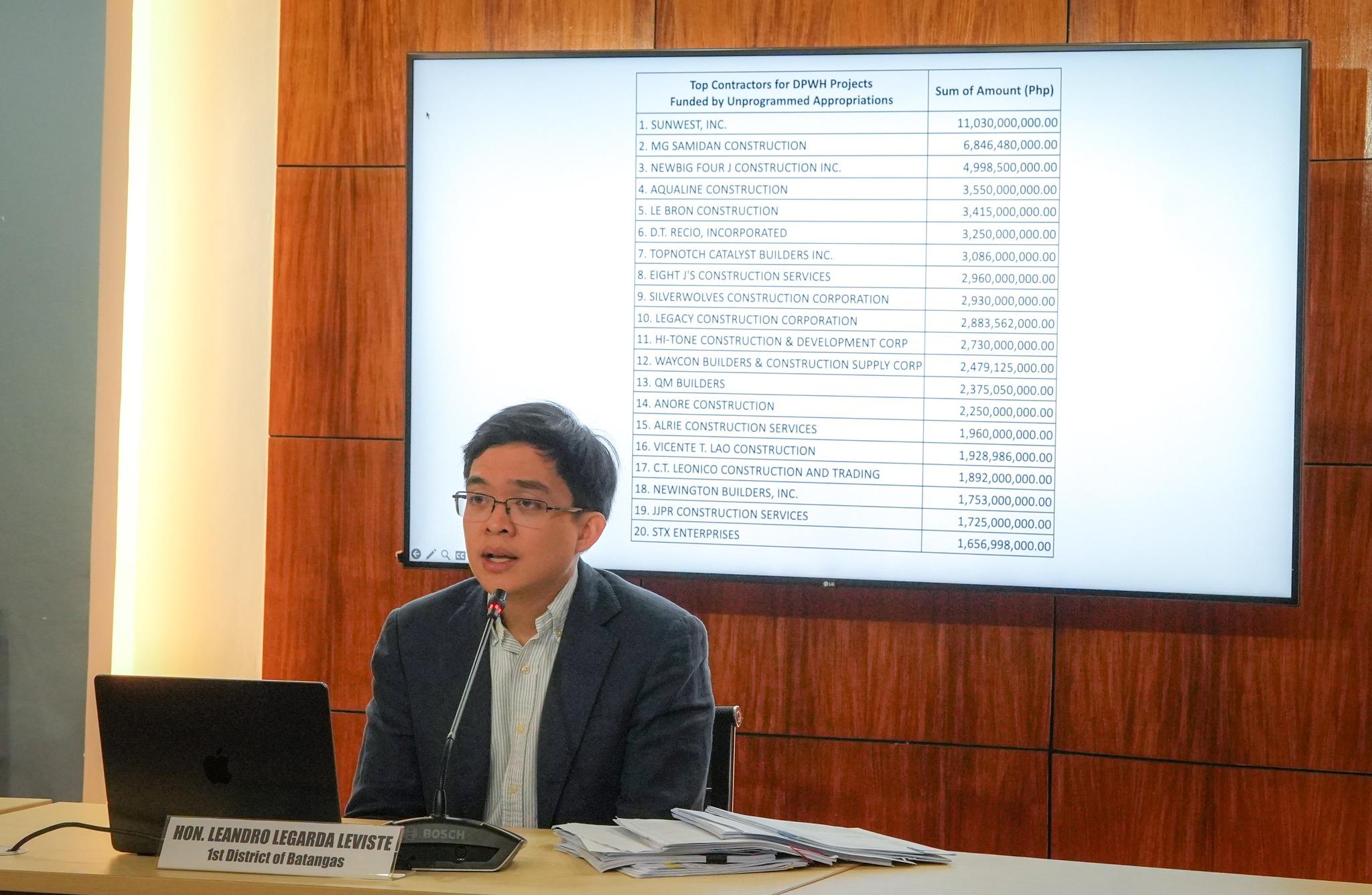 Batangas Representative Leandro Leviste on Wednesday revealed a list of contractors who, he said, scooped up the largest government contracts sourced from unprogrammed appropriations in 2023 and 2024.