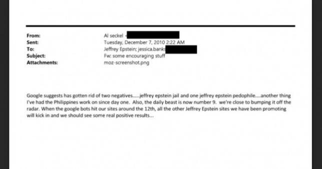 “Google suggests has gotten rid of two negatives … jeffry epstein jail and one jeffrey epstein pedophile … another thing I’ve had the Philippine work on since day one,” Seckel told Epstein in an email dated December 7, 2010.