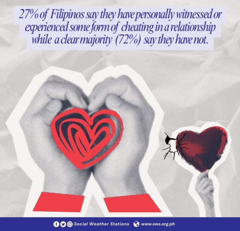 The survey found that 27% of Filipinos reported encountering some form of infidelity, while 72% said they have not.