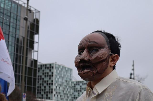 A protester donned a mask of former President Rodrigo Duterte as part of a skit presented by the Duterte Panagutin Network-Europe during its demonstration in front of the ICC on Sunday. Photo: Andy Peñafuerte III