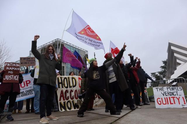 Groups critical of former President Duterte gathered in front of the ICC on Sunday to exact justice for thousands of drug war victims. One placard shows: “The people’s verdict… guilty.” Photo: Jay-vee Marasigan Pangan