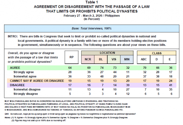 Based on the survey which was conducted from February 27 to March 2, 2026, 64% of Filipino adults agree with the passage of the anti-political dynasty bill into law, while 17% disagree, and 19% expressed indecision on the matter.
