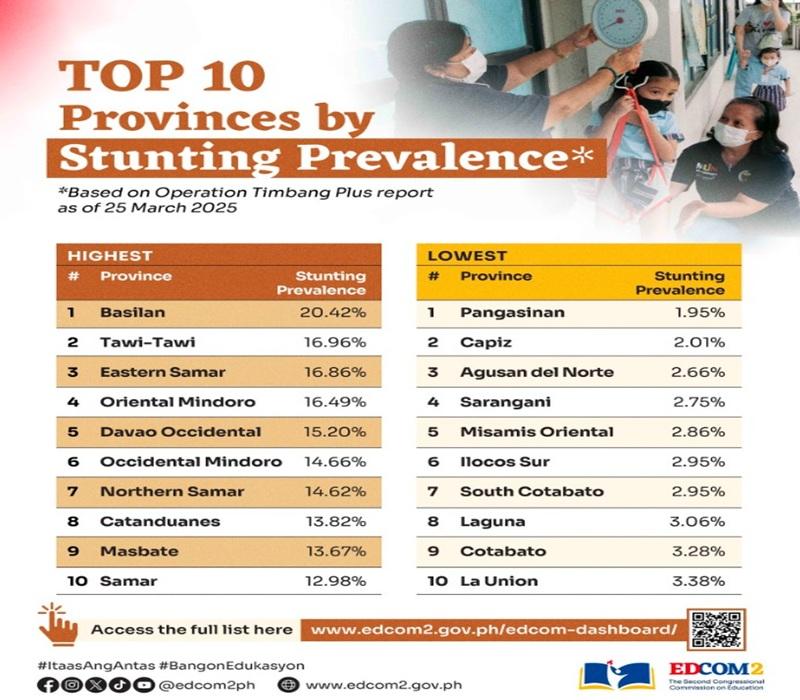 Basilan recorded the highest prevalence of child stunting in the country, according to data released by the Second Congressional Commission on Education (EDCOM II)