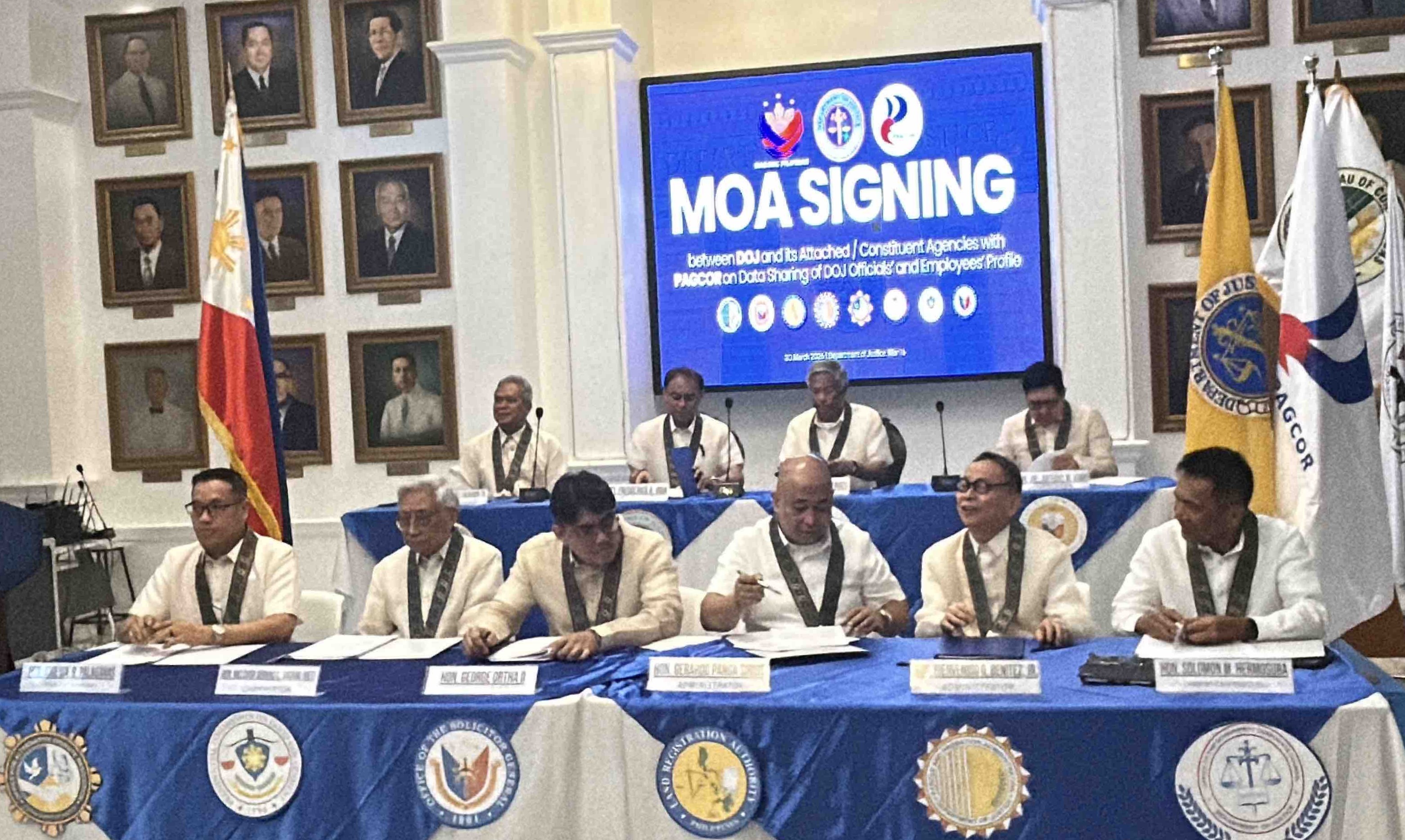 The Department of Justice (DOJ) and its attached agencies signed an agreement with the Philippine Amusement and Gaming Corporation (PAGCOR) to share employee information, in order to help prevent government workers from going to gambling venues.