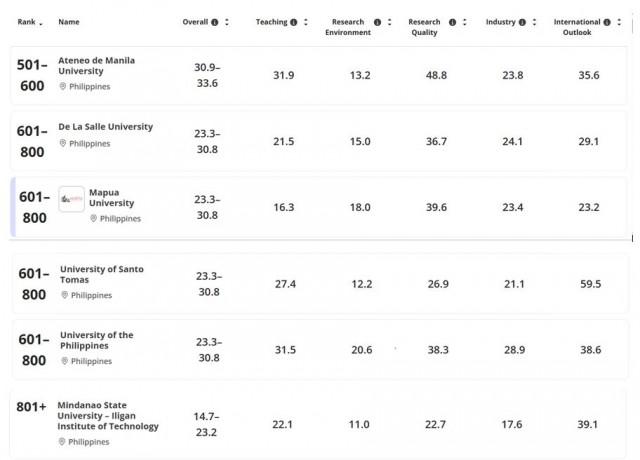 Meanwhile, four notable higher education institutions (HEIs)—De La Salle University (DLSU), Mapúa University, University of Santo Tomas (UST), and the University of the Philippines (UP)—all tied in the 601–800 bracket.