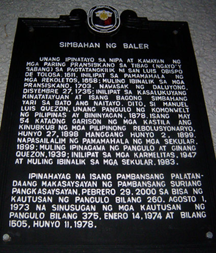 In the town square of Baler stands the unassuming Baler Church. Its stone façade doesn’t call attention to itself; the visitor’s gaze, in fact, is drawn more towards the well-landscaped Manuel Luis Quezon monument next to the church where a bronze statue of local boy Manuel sits comfortable and firm in his faith in the Pinoys’ ability to govern themselves—a belief we may not share in our more cynical moments—but that is why Quezon was a visionary and I am a grown man watching a (hit!) Disney musical. Despite its plain appearance, the Baler Church has a colorful story: It was the last piece of Philippine territory held by the Spanish empire. A commemorative plaque traces the church’s history back to 1611, and in one sentence sums up the historic Siege of Baler which signaled a momentous event in world history—the fall of the once-mighty Spanish empire and the rise of a brash, young American one: “…Isang may 54 kataong garison ng mga Kastila ang kinubkob ng mga Pilipinong rebolusyonaryo, Hunyo 27, 1898 hanggang Hunyo 2, 1899…”