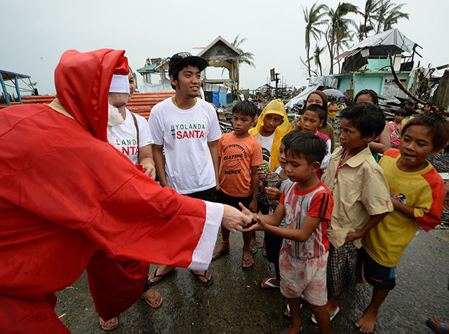 A foreign volunteer dressed as Santa Claus distributes goodies on Christmas Day to young survivors of Typhoon Yolanda in Tacloban City on December 25. Survivors from the Philippines' deadliest typhoon spent a gloomy Christmas surrounded by mud as heavy rain drove many inside their flimsy shelters. (Photo: AFP/ Ted Aljibe)