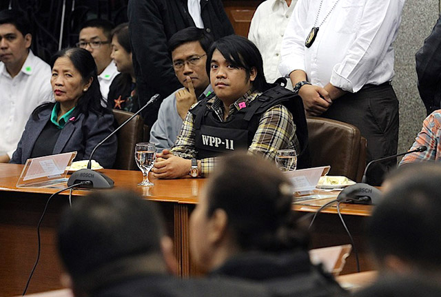 Merlina Suñas (left) and Benhur Luy, whistelblowers in the alleged P10B pork barrel scam, are seated across controversial businesswoman Janet Lim-Napoles (foreground) during a Senate inquiry last November 7. (Photo: Benjie Castro)
